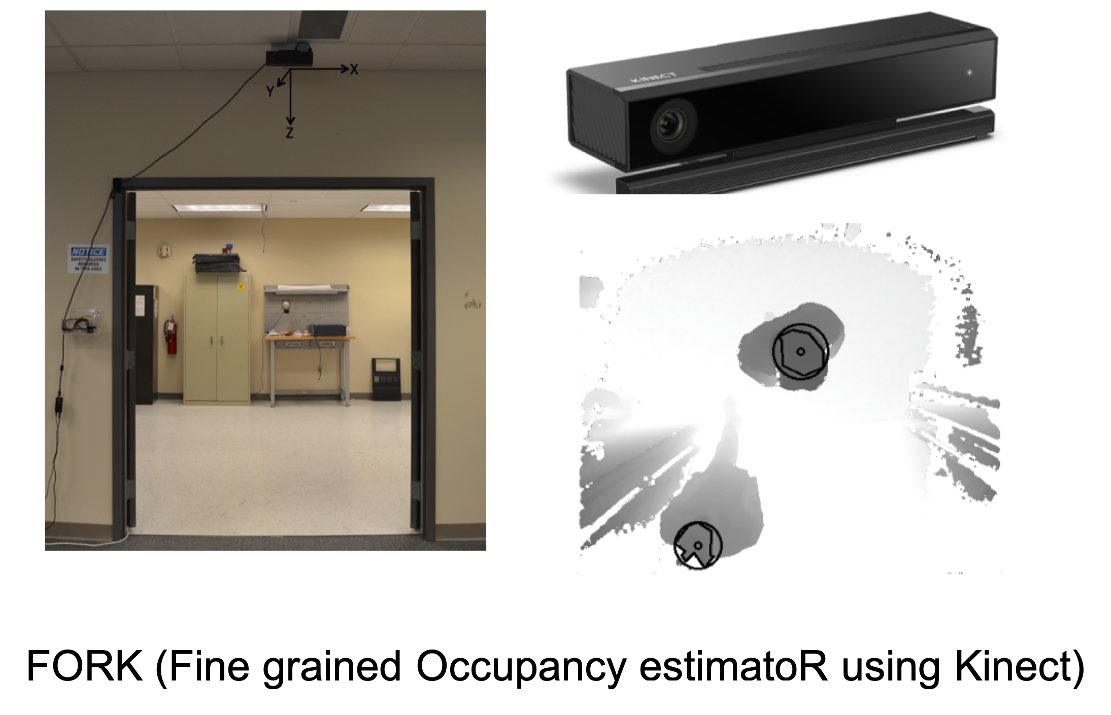 - Occupancy sensing and estimation: The project will use a depth sensor to detect number of occupants, their body structure, and other relevant parameters to determine their comfort level. It will consider many realistic scenarios in a commercial space, e.g., door opening and closing, people moving with backpacks/lunch boxes, cleaning workers moving with large drum of cleaning equipment, food caterers moving with box of foods, people carrying laptops in hands, people wearing caps, etc. It will investigate how to deal with noise in the depth data and how to co-ordinate among different depth sensors in order to cover larger entrance/exit areas. It will investigate what is the minimum frame rate and resolution to detect entrance and exit events while maintaining high accuracy, which will guide building a cheaper depth sensor for this application.